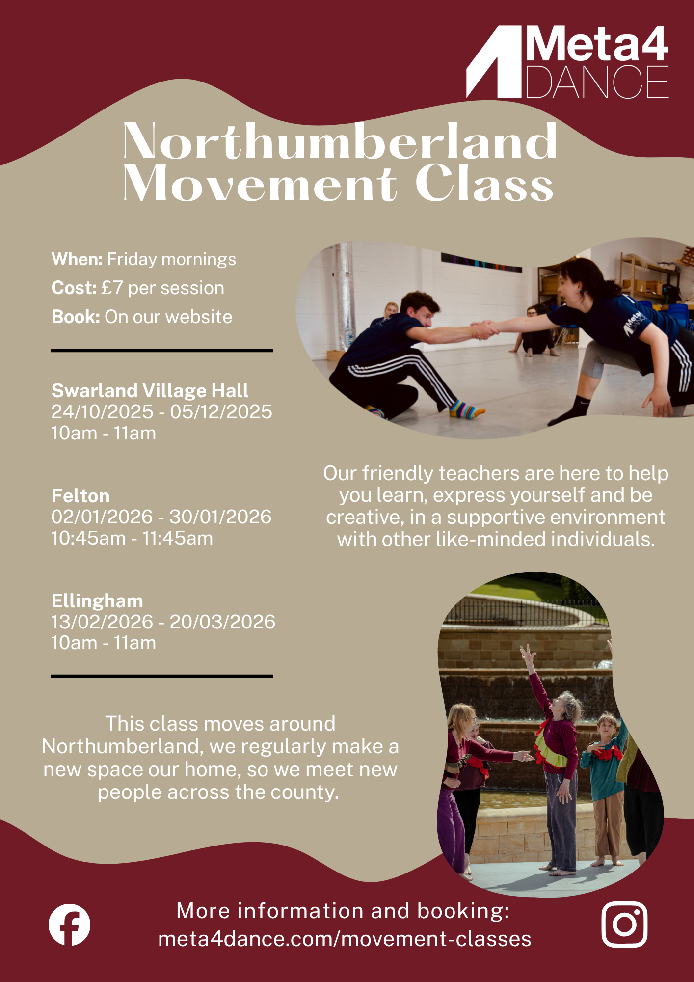 This class moves around Northumberland, we regularly make a new space our home, so that we meet new people across the county. If you can’t make it to the new space don’t worry, just keep an eye on where we are and come along when you can.